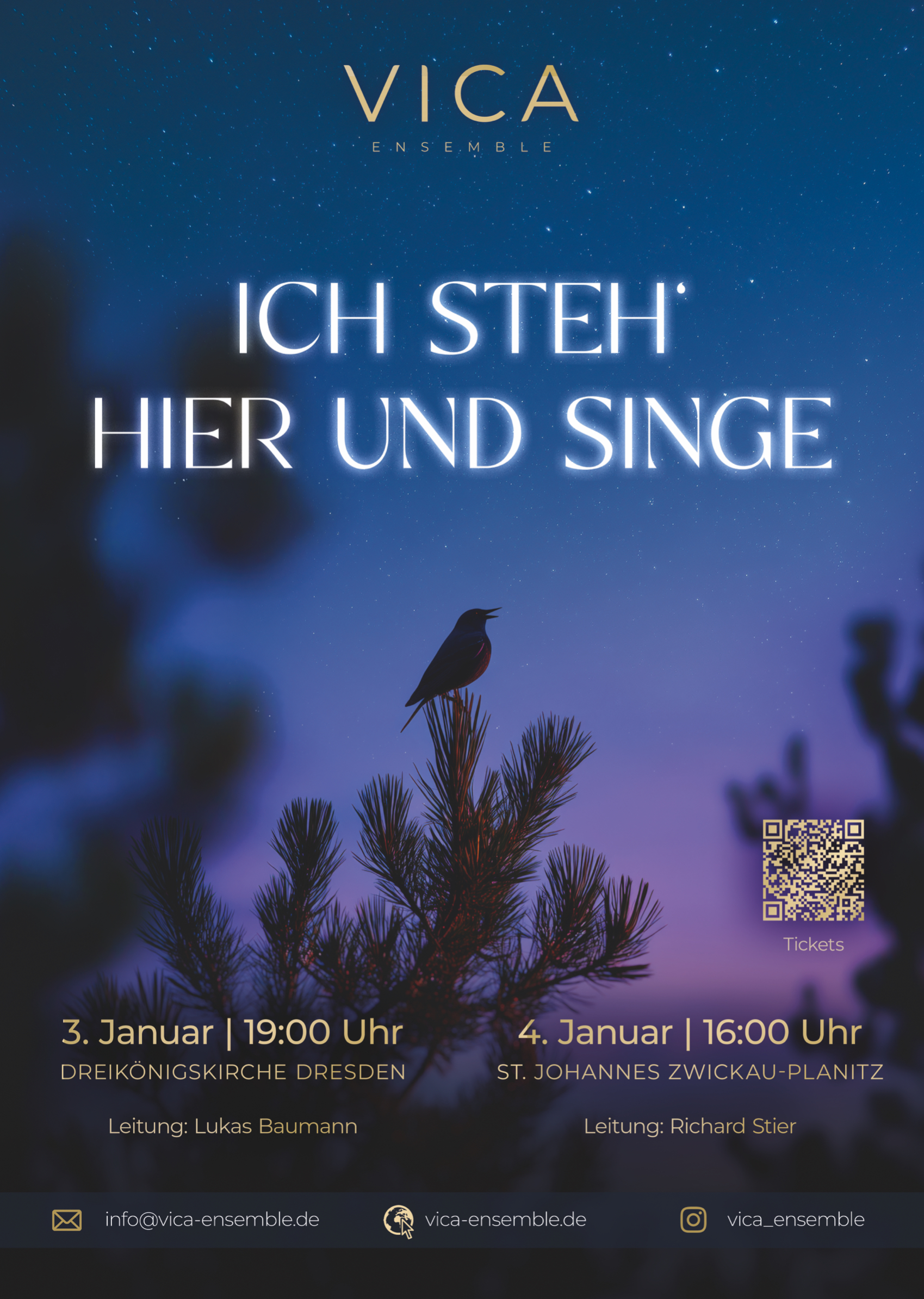 Das VICA Ensemble läutet das neue Jahr 2026 mit einem besonderen Konzertprojekt ein, welches unter dem Titel „Ich steh‘ hier und singe“ Johann Sebastian Bachs Motette „Jesu, meine Freude“ stimmungsvoll in ein A cappella Programm anspruchsvoller geistlicher und weltlicher Chorliteratur zum Jahresanfang einbettet.